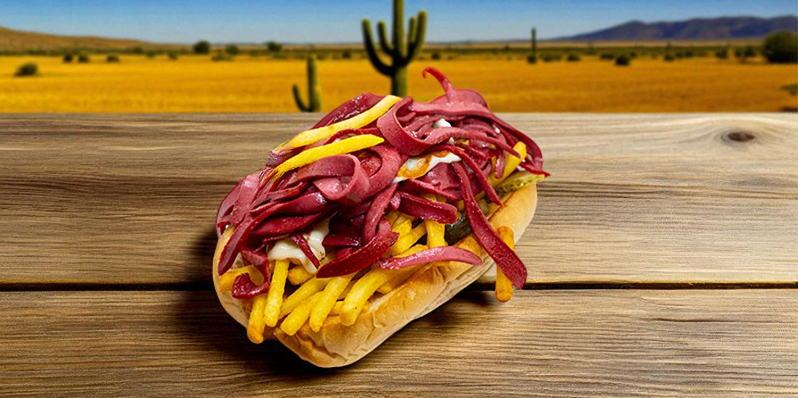 Sandviç ekmeğinde frankfurter dana sosis, kıtır patates, kıtır soğan, mozzarella peyniri ve cheddar peyniri il...